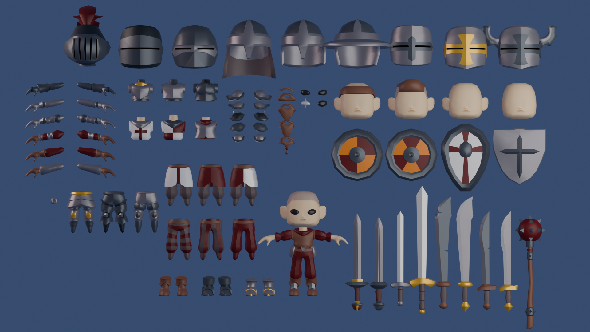FAQ: Why materials instead of a texture atlas? To make it easier to change colors and easier to apply custom shaders. In many cases, it’s also more efficient this way, especially for modular characters (For optimization: Remove the materials and replace them by material variants on your favourite game engine, this will consume nearly no resources).